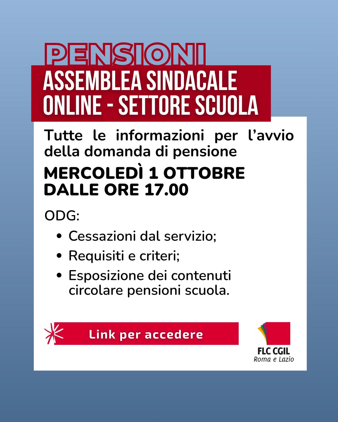Si trasmette per conoscenza a tutto il personaleDocumenti Assemblea_Sindacale_fuori_orario_servizio_1_ottobre_FLC_CGIL_su_Pensioni_2025 pdf - 666 kb Locandina_Assemblea_Pensioni_Scuola_2025_FLC_CGIL jpeg - 143 kb